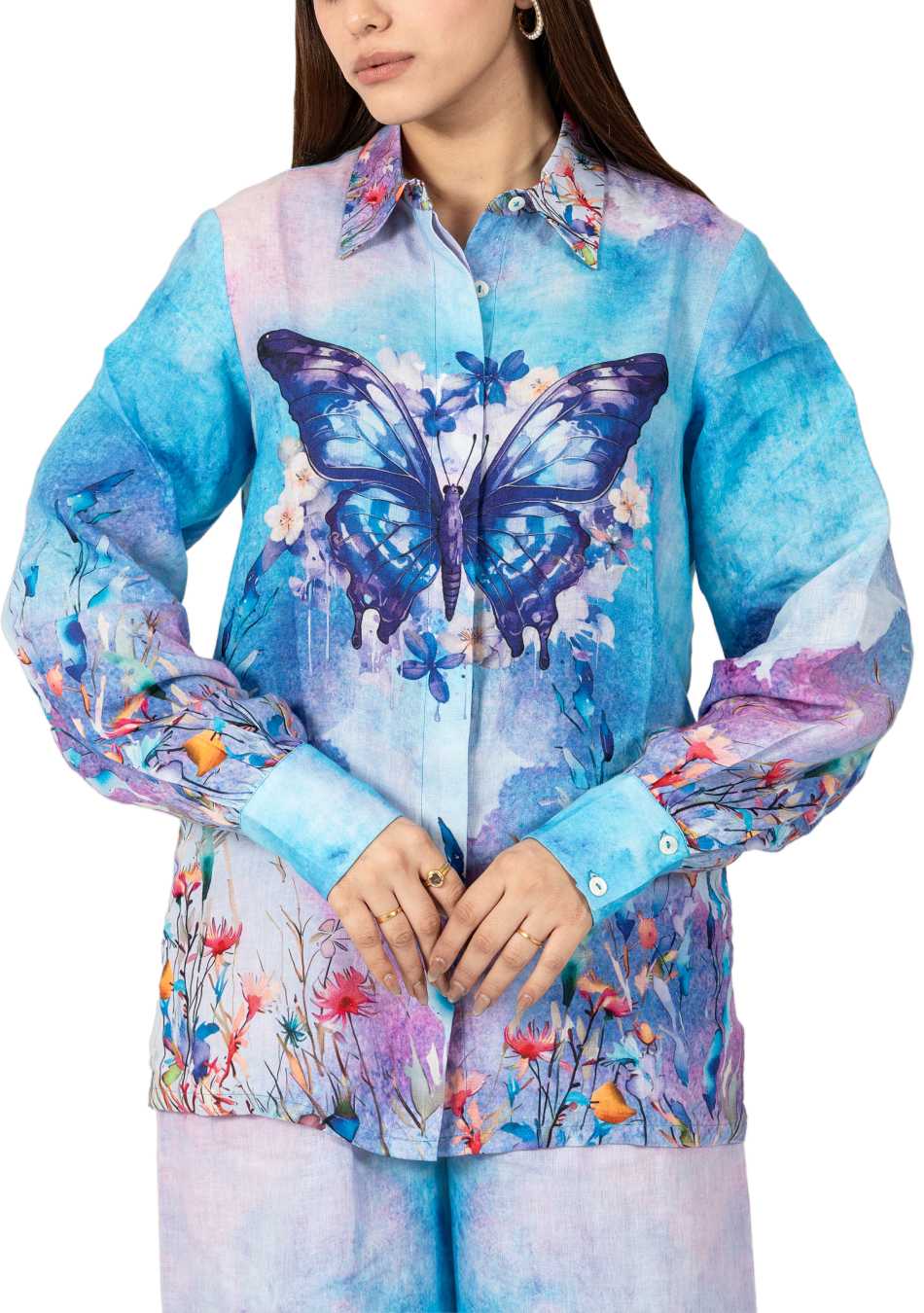 The Flutter Bloom Co-ord Set captures a poetic blend of art and elegance. Crafted from pure premium European linen in soothing hues of blue and purple, it features a relaxed-fit shirt and flowing pants adorned with delicate butterfly and floral placement prints. Subtle Swarovski embellishments add a refined touch of brilliance, creating a look that’s effortlessly graceful and timeless.