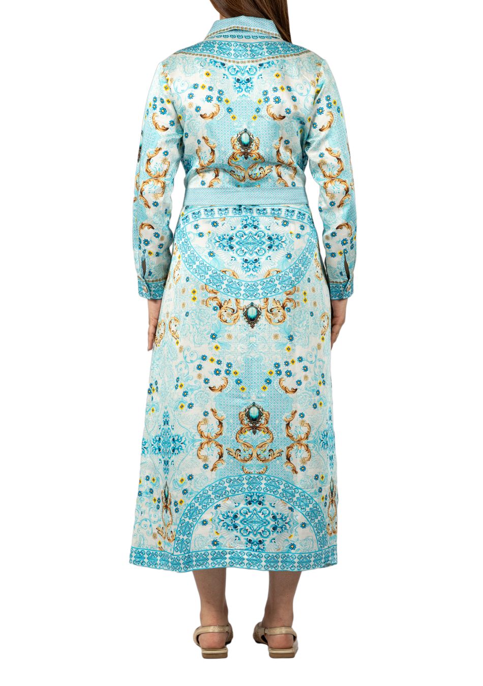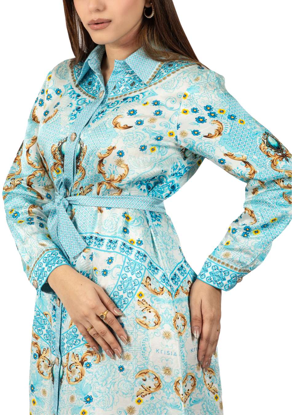 Dry clean recommended to preserve crystal embellishment and print vibrancy.
