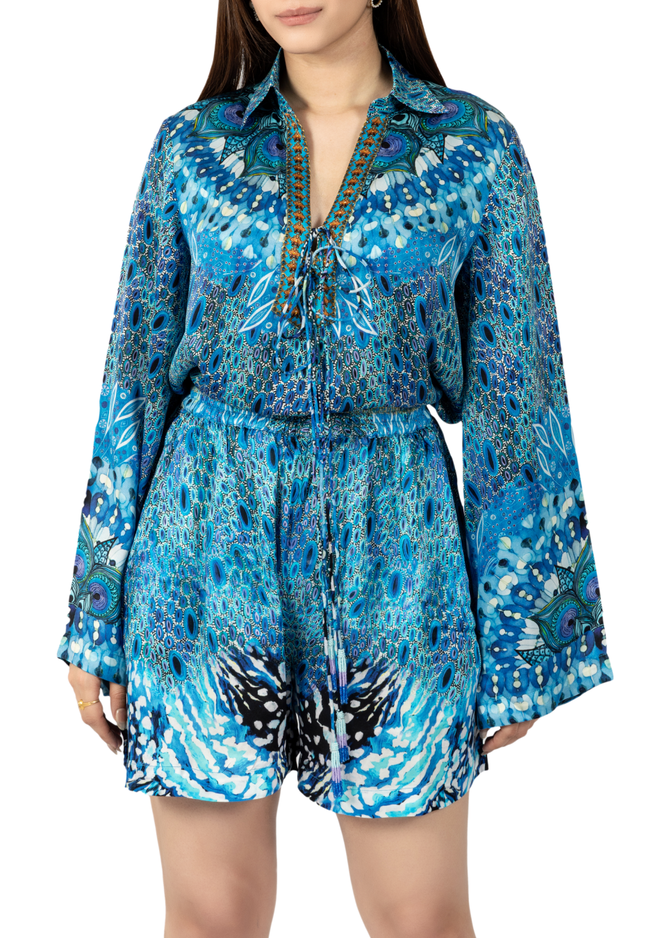 The Placement Printed Bell-Sleeve Co-ord Set is tailored from pure premium European linen. The fluid silhouette features a relaxed shirt with gracefully flared sleeves and coordinated shorts, brought to life through intricate placement prints in rich blue hues. Accented with delicate Swarovski embellishments, it reflects a perfect balance of modern elegance and timeless ease.