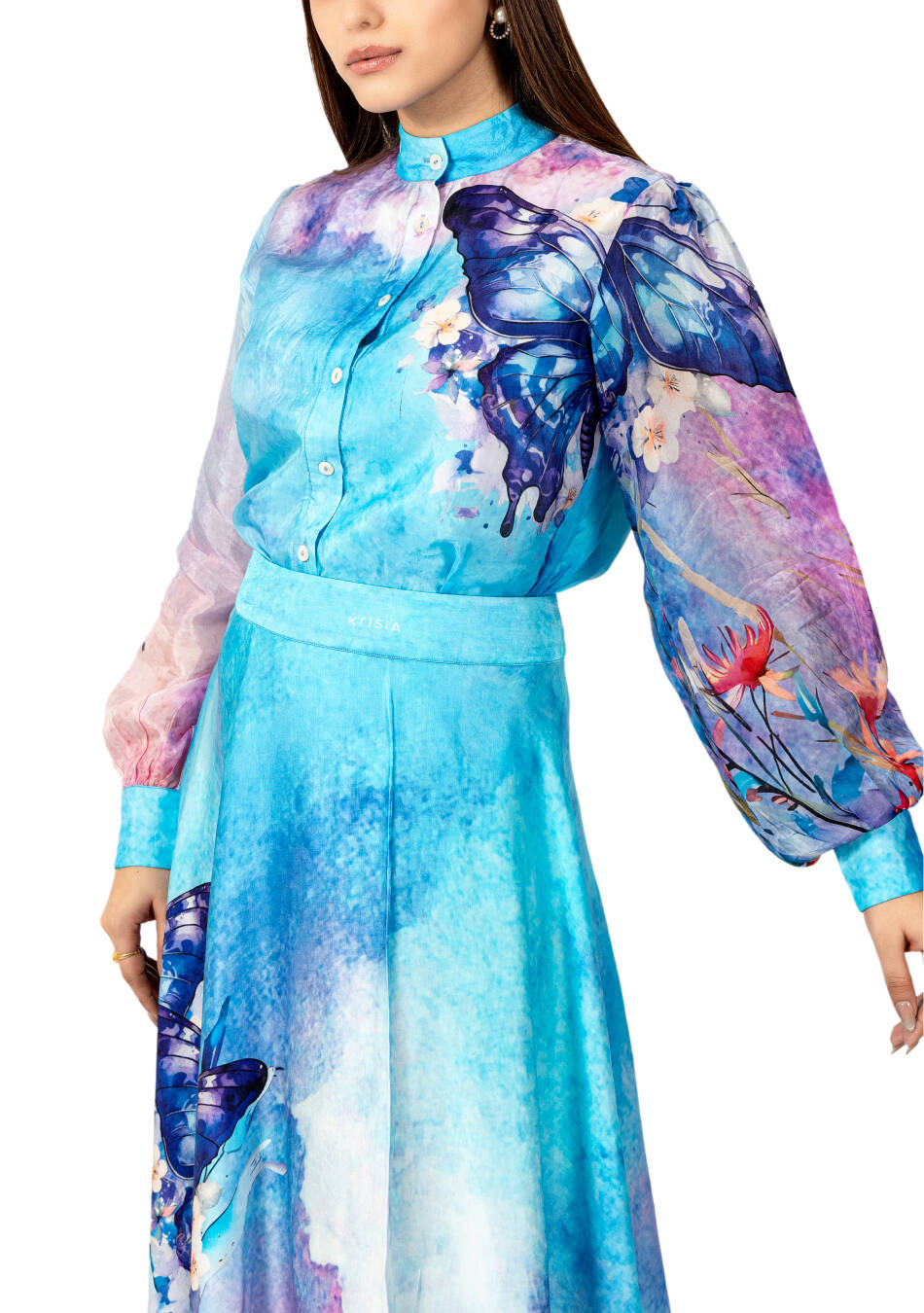 The Flutter Bloom Printed Co-ord Set captures the essence of dreamy elegance through soft watercolor hues of blue and purple. Crafted from pure premium European linen, it features a delicately printed shirt with balloon sleeves and a flowing skirt adorned with ethereal butterfly and floral motifs. Subtle Swarovski embellishments add a touch of luminosity, making this relaxed-fit ensemble a perfect blend of art, comfort, and sophistication.